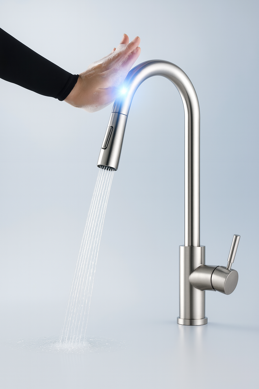 Jak działa czujnik dotykowy? Wystarczy dotknąć wylewki kranu palcem lub nadgarstkiem, a woda zaczyna płynąć. Kolejne dotknięcie wyłącza wodę. Nie musisz brudzić uchwytu brudnymi rękami.