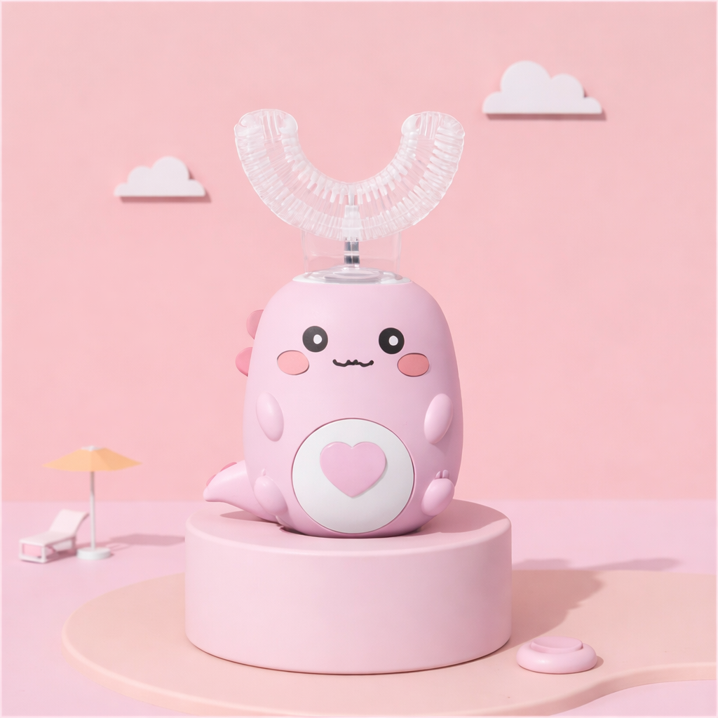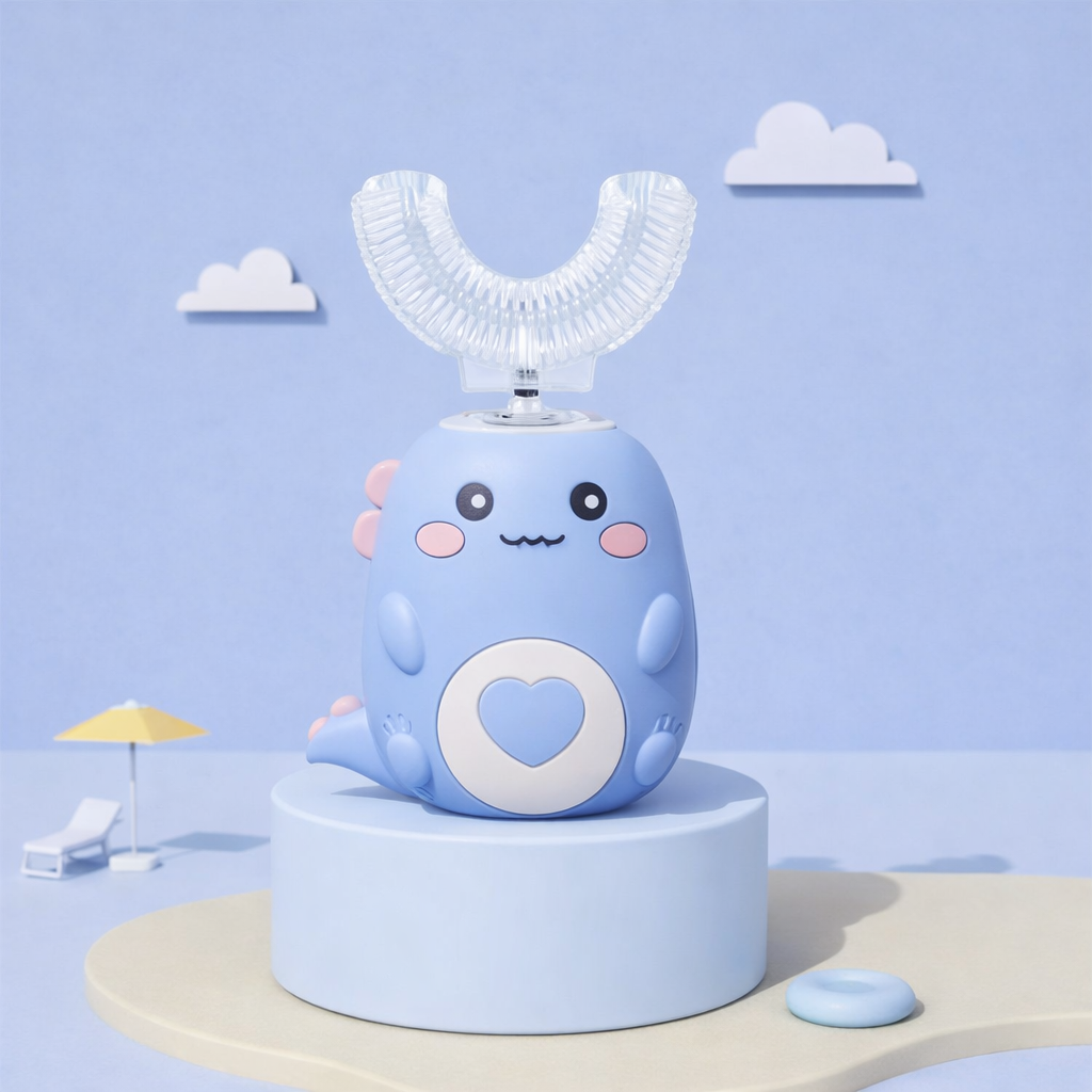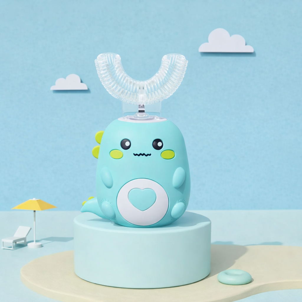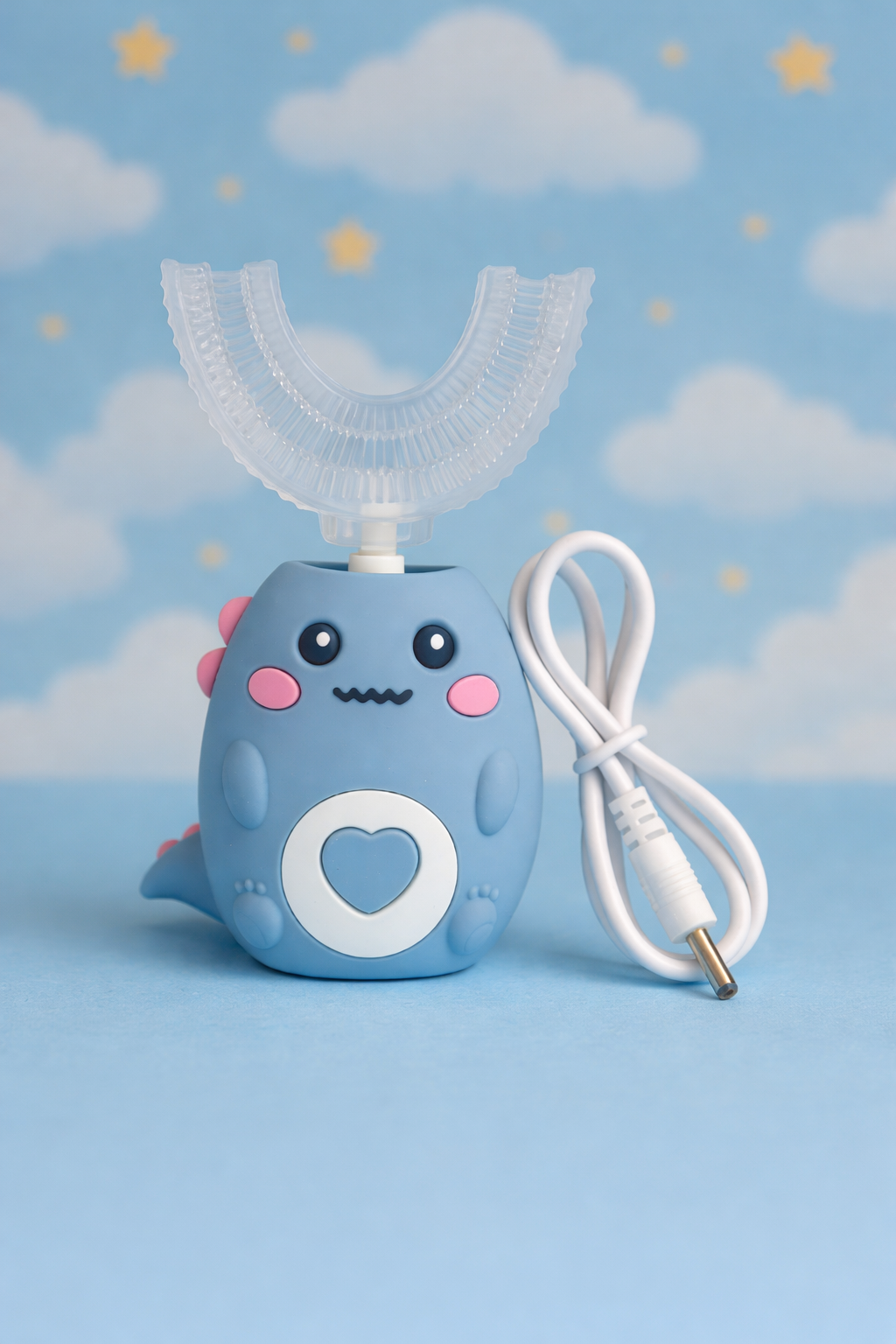 Szczoteczka w kształcie litery U z miękką, silikonową głowicą oraz kabel do ładowania, dzięki któremu urządzenie jest zawsze gotowe do użycia.